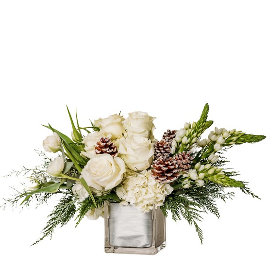 Need a quiet spot to reflect? Tender Tranquility will transport you there. White roses and hydrangeas are beautiful arranged in a square cube in this elegant arrangement. Approximately 26"W X 13"H