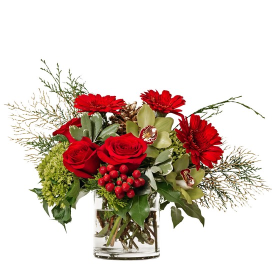 Lift their spirits on a cold winter day. Berrylicious is a perfect mix of whimsy and warmth Red Roses and gerberas in a glass cylinder will add warmth to any space. Approximately 18"W X 15"H
