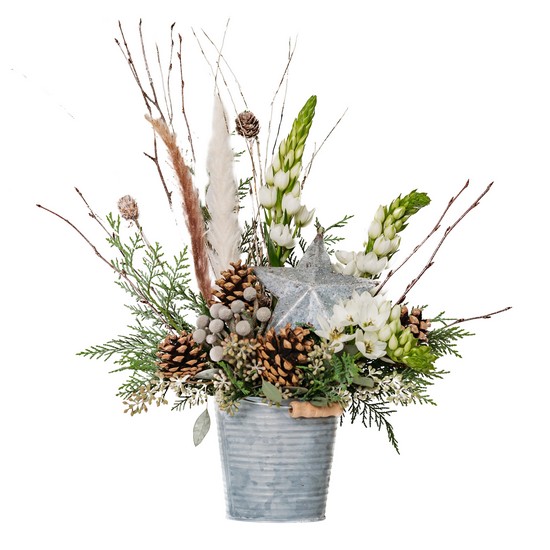 You light up the room. Shining Star will be the center of attention. A tin pail holds this silver star is surrounded by Pampas Plume, Star of Bethlehem, and other seasonal favorites in this adorably rustic design. Approximately 20"W X 27"H