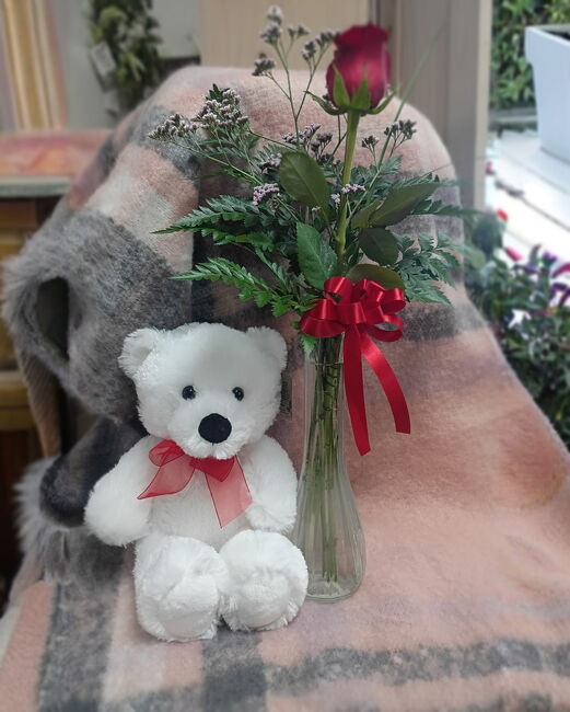 Come in to pick up an elegant red rose bud vase with a cute cuddly bear to go with it.
