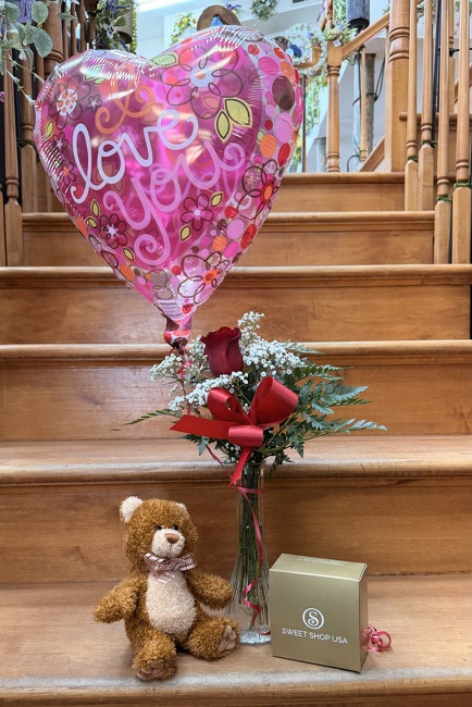 Enjoy this elegant red rose bud vase sent alongside a four piece box of our gourmet Sweet Shop Truffles, a plush bear & a balloon special to your occasion!