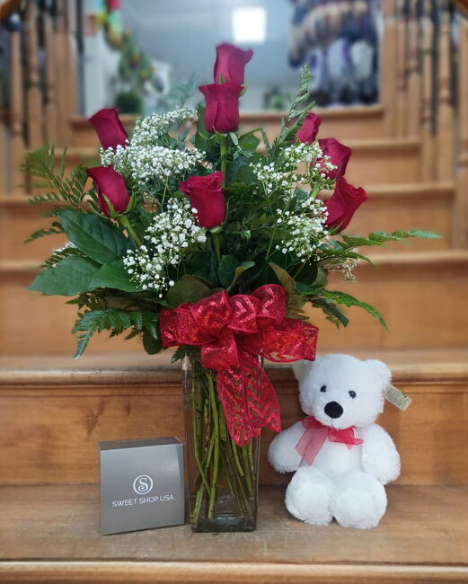 A dozen red roses arranged in a vase with a small plush animal and a four piece count of our gourmet Sweet Shop Truffles attached